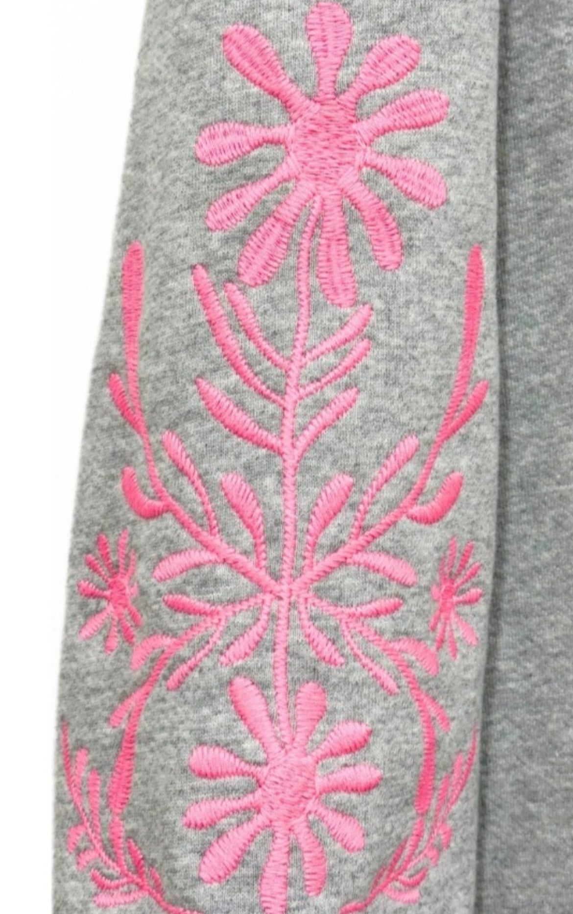 Destaca por sus bordados de flores color rosa en contraste con el gris del tejido.
